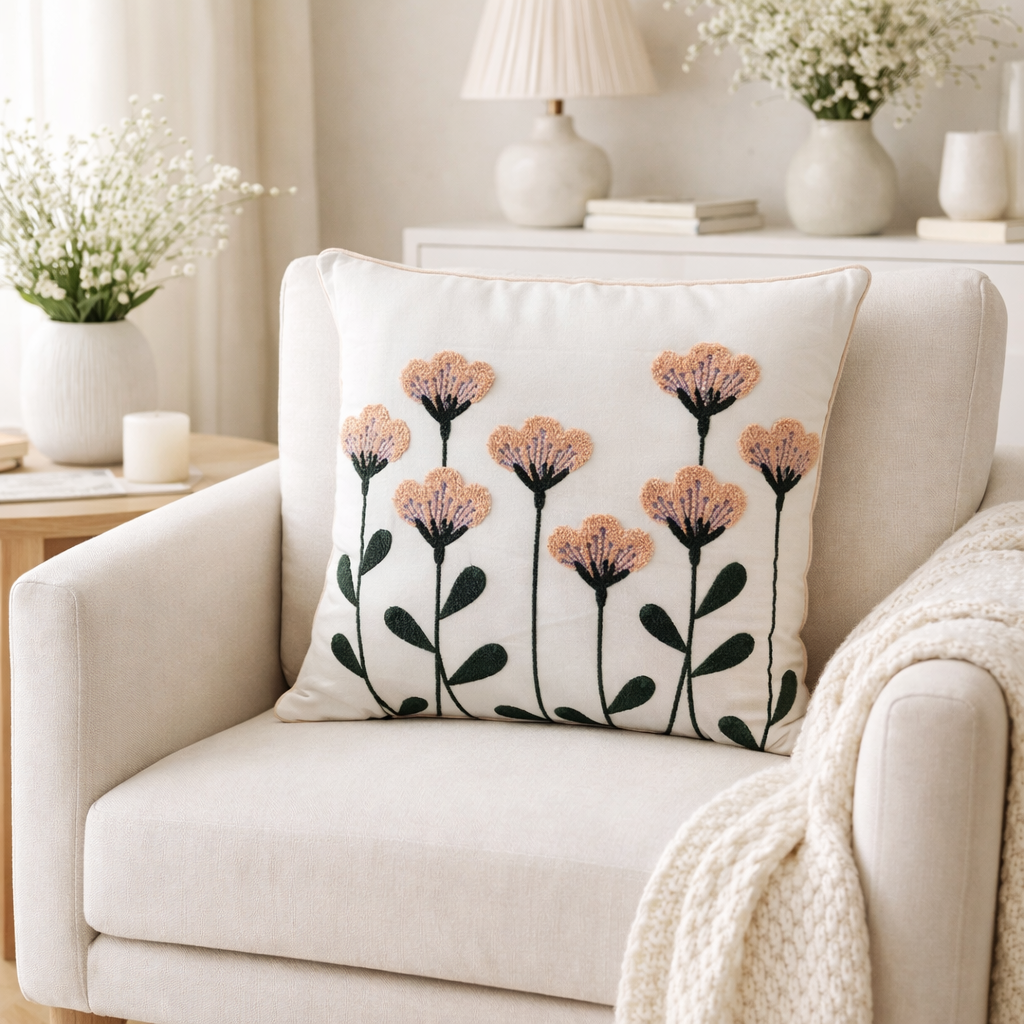 Transforme seu espaço com a Almofada Bordada uma peça que une o charme artesanal a um conforto inigualável. O bordado em relevo, com um design de plantas silvestres e flores delicadas, cria uma textura rica e um visual rústico chique que adiciona vida e personalidade a qualquer sofá, poltrona ou cama.