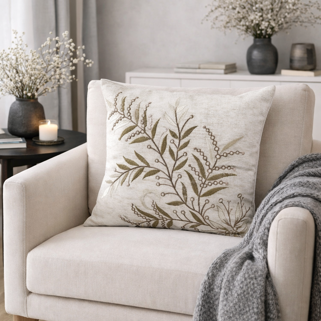 Transforme seu espaço com a Almofada Bordada uma peça que une o charme artesanal a um conforto inigualável. O bordado em relevo, com um design de plantas silvestres e flores delicadas, cria uma textura rica e um visual rústico chique que adiciona vida e personalidade a qualquer sofá, poltrona ou cama.